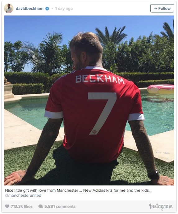 Cựu thủ quân tuyển Anh tiết lộ rằng đây là món quà mà đội bóng cũ đã gửi tặng anh. Chiếc áo là đồng phục mới của Quỷ đỏ và do đối tác mới Adidas sản xuất cho mùa giải Premier League 2015/16, có tên David Beckham cùng với con số 7 huyền thoại. Không chỉ Beckham mà các con của anh cũng có những chiếc áo đấu mới của đội chủ sân Old Trafford.