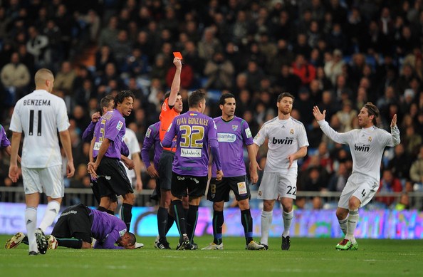 Ronaldo đã ghi cả hai bàn, giúp Real Madrid thắng 2-0 trước Malaga nhưng sau đó anh đã phải rời sân vì nhận thẻ đỏ sau tình huống dùng cùi trỏ với Patrick Mtiliga.