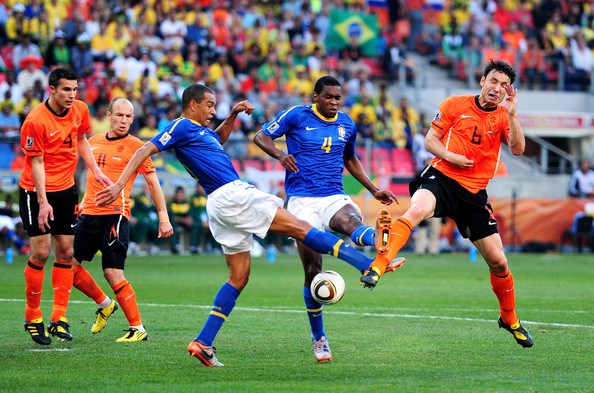 Hà Lan và Brazil, như đã nói phía đầu là một cặp ví dụ như vậy. Hai đội bóng này vẫn luôn được biết đến là những tập thể giàu sức cống hiến, chơi bóng bằng thứ cảm hứng bất tận nhưng hình ảnh của họ tại Nam Phi lần này hoàn toàn trái ngược: thể lực, toan tính, thậm chí còn thô bạo và tất cả những điều đó đều xuất phát từ cặp tiền vệ trung tâm. Trong cái thời điểm mà sơ đồ của bóng đá thực dụng 4-2-3-1 đang thịnh hành, thì Hà Lan và Brazil cũng không nằm ngoài vòng xoáy ấy. Với Hà Lan, họ chọn Van Bommel và De Jong còn bên phía Brazil, đó là Felipe Melo và Gilberto Silva. Nghe qua những cái tên này thôi, đặc biệt là Melo và De Jong cũng đủ khiến nhiều fan hâm mộ lạnh người vì nhớ lại những “chiến tích” mà hai gã “đồ tể” này từng lập nên. Rất thú vị, họ đã gặp nhau ở tứ kết và một trong hai người đã trở thành tâm điểm. Melo là tâm điểm đó. Phút thứ 10, anh chọc khe kĩ thuật cho Robinho mở tỉ số, sang đến hiệp hai, Brazil bị thua ngược 1-2, anh tiếp tục đặt dấu ấn bằng… tấm thẻ đỏ sau khi dẫm lên người Robben. Brazil không thể vùng lên và chấp nhận về nước sớm còn với De Jong, chất “đồ tể” của anh tới trận chung kết mới bộc phát rõ!