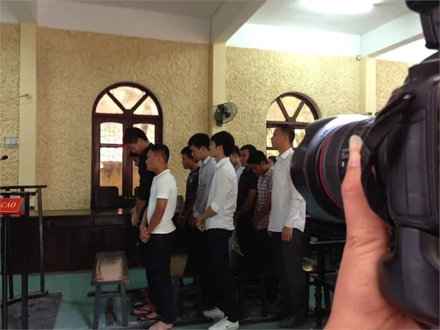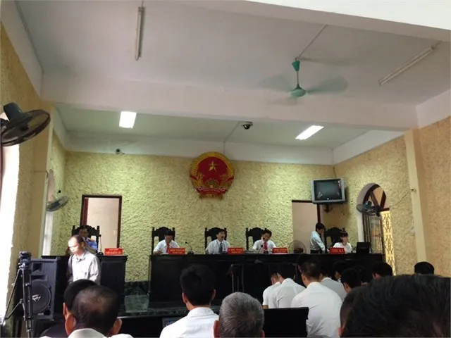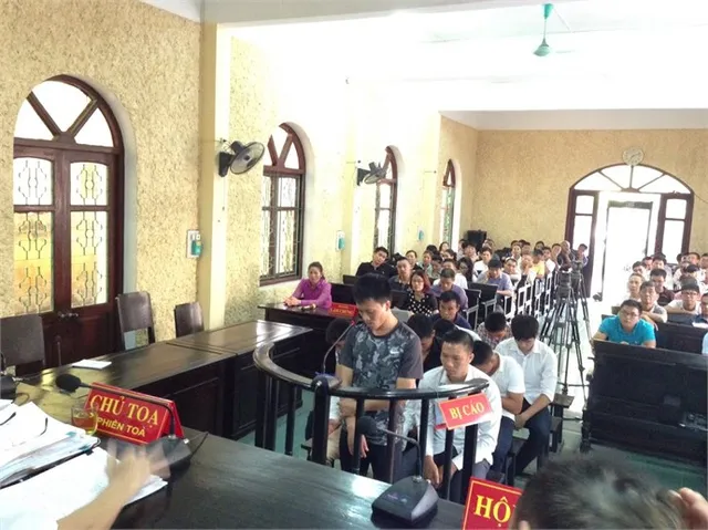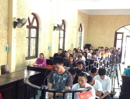 8h: Sau phần kiểm tra căn cước, chủ toạ phiên toà đang phổ biến cho các bị cáo về quyền và nghĩa vụ tại phiên xử sơ thẩm.