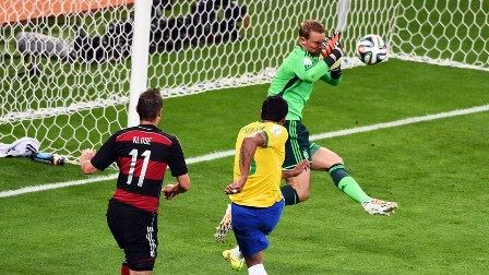 50' Sau giờ nghỉ, Brazil trở lại hiệp 2 với tinh thần thi đấu tốt hơn. Vừa rồi thì Neuer phải rất vất vả cản phá cơ hội của Brazil với pha căng ngang của Ramires